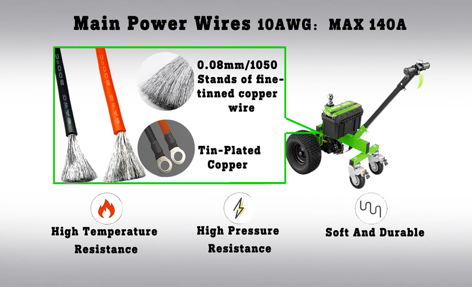 The main power wires use 10AWG conductors and support a maximum current of up to 140A. This configuration ensures stable power transmission for electric trailer dolly systems while minimizing voltage drop and energy loss under high load conditions.