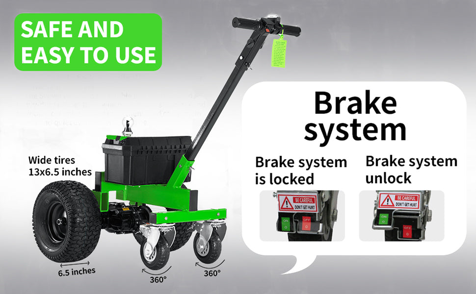 The brake system features a dual-locking design that securely locks the electric trailer dolly caster wheels in place. This provides enhanced stability and double safety protection, particularly when the trailer dolly must remain stationary, such as during trailer cover installation or maintenance tasks.