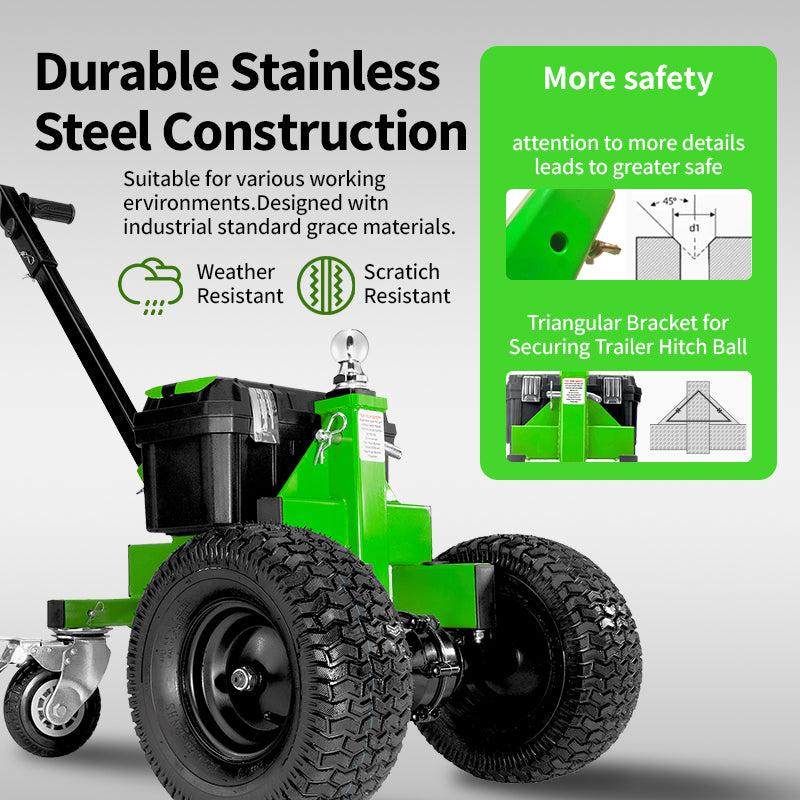 Built with a heavy-duty steel construction, this motorized trailer dolly is engineered to withstand harsh outdoor environments. The unique 4-wheel configuration—including two 13-inch x 6.5-inch wide drive tires and two 6-inch swivel caster wheels with brakes—provides superior stability, maneuverability, and secure positioning when stopped.